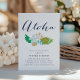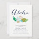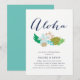 Aloha! Planerar du en hawaiiansk eller luau-inspirerad välkomstmiddag inför det stora dagen? Bjud in vänner och familj med våra söta välkomstinbjudningar till bröllopsmiddag, med en bukett tropiska blommor i elegant strandinspirerade färger och "aloha" i modern, elegant kalligrafi. Baksidan är i enfärgat akvamarin.