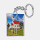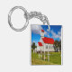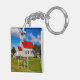 Traditionell isländsk kyrka med rött tak och omgiven av gräsmatta, träd och några kor.