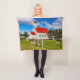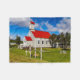 Traditionell isländsk kyrka med rött tak och omgiven av gräsmatta, träd och några kor.