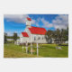Traditionell isländsk kyrka med rött tak och omgiven av gräsmatta, träd och några kor.