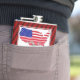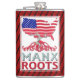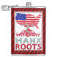 Isle of Man Manx American Hip Flask. USA Karta med en blandad amerikan och Isle of Man flagga. Med texten MANX ROOTS nedanför rötterna i träd.