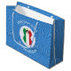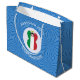 Stor presentpåse med vår ängel som bär Italiens flagga för firande av högtider eller dekorationer för Hanukkah. Den italienska flaggan-ängeln finns inuti en vit cirkulär fraktal av snurriga fyrkanter. Bakgrunden är en blå fraktal av snurriga fyrkanter. Lägg till egen text eller personifiera med ett namn och året. Flaggan består av tre vertikala ränder i rött, vitt och grönt. Den kallas ibland för IL TRICOLORE.