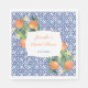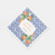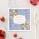 Orangar med handmålad vattenfärg med grönt löv och söt blommar mot en vintage blå och vit keramisk plattform.
