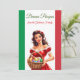 Festive Påsk-hälsningskort med kursiv flagga och kursiv kvinna med röd klänning med vit snöre-trim. Hon håller en tork basket fylld med färgstarka, dekorerade Påskägg. Texten längst upp i bilden lyder "Buona Pasqua" i skript för grönt av elegant, som är italienskt för "Glad påsk". Du kan anpassa det här kortet med ditt namn. Bellissima Italia ©