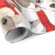 Den italienska greyhound är klädd för julhelgen på en röd vinterscarf och skapar en roligt mönster i hundar för att ha slagit in julklappar i hund älskare.