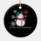 This image features a cheerful cartoon snowman wearing a Christmas hat and scarf, surrounded by colorful snowflakes against a black background. The bright green text at the bottom, "It's my first Christmas," celebrates a first Christmas moment, making it an adorable and festive design.