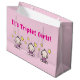This cute "It's Triplet Girls!" large gift bag in pink is perfect for your triplets baby gift. Make your triplet girls baby shower gift more special by using a custom gift wrap. The bag features three cute baby cartoons and the message "It's triplet girlss" while the back is teeming with lots of triplet girl babies. Simply fill it up with diapers and you have a great and practical triplets baby gift! Designed by Best Baby Gifts for Triplets - given with love.