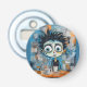 En fantasifull karaktär med stora ögon och pigg hår visas med en häpen min sittande vid ett bord med en ångande kopp och en udda toaster. Bakom karaktären är bakgrunden livlig, fylld med olika skisser och klotter som ger en lekfull, kaotisk stämning till scenen.