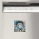 En fantasifull karaktär med stora ögon och pigg hår visas med en chockad min sittande vid ett bord med en ångande kopp och en udda toaster. Bakom karaktären är bakgrunden livlig, fylld med olika skisser och klotter som ger en lekfull, kaotisk stämning till scenen.