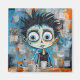 En fantasifull karaktär med stora ögon och pigg hår visas med en häpen min sittande vid ett bord med en ångande kopp och en excentrisk toaster. Bakom karaktären är bakgrunden livlig, fylld med diverse skisser och klotter som ger en lekfull, kaotisk stämning till scenen.
