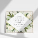 I vår samling av vattenfärgen blommigt bröllop i Elfenbenskusten finns delikatmålade vattenfärgsgreer, eukalyptus löv, botaniskt lövlök i grönt och vita och elfenbensblommor. Anpassa välkomsttecknet i elegant bröllop med namn och bröllop-datumet inkapslat i ett utdraget diagonalt ram.