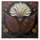 En fyrkantig relief på en svart bakgrund med en central vit blomma med skiktade petaler, med två stora, mönstrade löv i bruna och röda nyanser. Små gula blommor är utspridda runt kant och hela sammansättningen är uppbyggd av ett gräns av bruna vinstockar och löv.