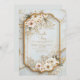 Create a serene and luxurious atmosphere for your special day with this stunningly elegant invitation. The design features a background of soft, icy azure marble, swirled with delicate veining and scattered with metallic glitter dust for a high-end, ethereal feel. The focal point is a magnificent ornate frame with a unique, Moroccan-inspired shape, outlined in a shimmering antique gilded texture that adds regal structure. Adorning the top left and bottom right of this frame are graceful arrangements of white cosmos and wildflowers, accented with sage leaves and intricate bronze metallic branches. This airy and sophisticated aesthetic is a flawless choice for a winter wonderland wedding, a spring garden bridal shower, or a luxurious high tea event. You might also select this polished design for a milestone birthday celebration, a "something blue" themed engagement party, or a formal anniversary dinner for a couple who loves refined elegance.