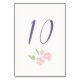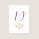 This simple and whimsical wedding table number card features a contemporary set of purple fonts, a blush watercolor floral illustration, as well