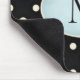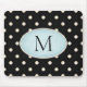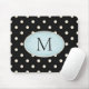 Anpassningsbarnas musknapp har ett monogram av eleganten i ett blek blått ovalt ram mot bakgrund av stort polka dots i antikvit på svart.