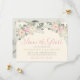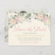 Den här eleganten Boho stil bröllop spara datum har romantiska blommor, botaniska löv och dragande fågelfjädrar. Anpassa med anpassningsbar för ditt stora evenemang och med ett favoritfoto på förlovningen längst bak på kortet. Mjuka färg-schemat omfattar nyanser av rosa, persikor, kräm, grönt, grått och guld.
