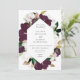 Elegantens blommigt, den geometriska formen ram, bröllopsinbjudan. Kortet har en vacker elfenbensvit och mörk plum lila blommor med rik grönt och gyllene bladgrej. En enkel typisk utformning av stil och samordning av uppbackningen av färg vid lila av plommon.