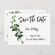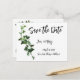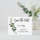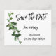 Spara datumkorten med varierad visuell dekoration. Minimalistisk utformning där du kan anpassa par namn och plats för bröllop. Enkel grönt lämnar på kortets framsida och baksida.