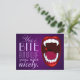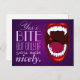 Kreepy campy skräckshow art, vampyrtänder, demon eller monsterfangs, en shlock horror tecknad stil teckning i en stor öppen mun med ljusa vita vassa tänder, en röd droppe blod, rött läppar, djup lila gradient bakgrund och bok hund text. En smak av vampyr humor med elegant roligt typsnitt. Du kan använda anpassningsfunktionen om du vill ändra stil, storlek eller färg om du vill. Detta vykort är underbart och skickas som ett lapptäcke mellan vänner eller häng som väggkonst, för vampyrer, mörkar och dam och andra nattliga blodtörstiga varelser.