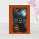 Det här vita Halloween-kortet visar en lekfull blandning av en svart katt och en jack-o'-lantern, som båda är glatt i ljuset av ett fullt måne. Kattens ansikte visas som en karvpumpad pumpa som lägger till en unik och humoristisk vrid till den klassiska Halloween-bilden. Mörken, grumlig natt och höst löv satte perfektens smakande atmosfär, skapar det som ett idealiskt val för var och en som har lite eländig roligt under Halloween. "Happy halloween" hälsning på omslaget gör det till ett underbart kort för att skicka festlig cheer med en aning mysterium.