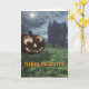 Halloween-hälsningskortet har en originalgrafik av en slipande Jack-O-Lantern och ett skådespel som hemsöks av fladdermöss i måndagsljus, skapat av konstnären Jayne Wilson i Vue d'Esprit. Insidan lyder: Vid denna speciella tidpunkt på året när jack-o-lyktor glöder, är ge en välkommen chans att sända en varm "Hej!" Happy halloween.