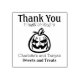 Detta anpassningsbar företag eller företag i frimärke har "Tack" överst med ett företag i namn som ingår i urvalet och som är utskrivet grund i frimärke. Både exempelmeddelandet och affärsmeddelandet namn kan vara personlig för att inkludera ditt eget namn- eller anpassningsbar-meddelande eller -citat. Mittpunkten i frimärke har en spooky tittar Jack o lantern-pumpa. Den här bilden kan också ersättas med din egen personliga logotyp. Ett dekorativt gräns placeras under "Tack"-meddelandet för att lägga till en kursrörelse. Den perfekt som en bageributik, en söt butik eller en affär för att visa för dina kunder hur mycket du uppskattar dem. Det är perfekt för Halloween- eller Fallsäsongen.
