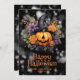 Glad Halloween-kort med en pumpa som bär en svart hatt och är prydd med lila och orange blommor. Personliggör enkelt detta Halloween-kort med ditt familjenamn och text.