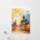 Halloween-kort med en vattenfärgad illustration av en hemsökt kyrka, fladdermus och jack o’lanternor. Anpassa enkelt det här vattenfärgen Halloween-kortet med din familj namn och text.