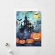 Halloween-kort med en vattenfärgad illustration av en hemlig mansion, Måne, fladdermus och jack o’lanternor. Anpassa enkelt det här vattenfärgen Halloween-kortet med din familj namn och text.
