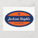 Oval-skyltning med stadsdelarna i New York City. Officiellens orange och blå färger av NYC. Jackson Heights i Queens.