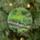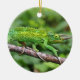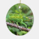 Fotografera av ett ljust - den gröna reptilen som kallas en Jacksons kameleont, också kallat tre den Horned kameleonten som går längs en gren som omges av gröna löv och vines i en botanisk trädgård i Hawaii. Går grönt!