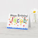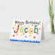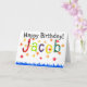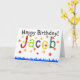 Ett ljust färgrikt födelsedagkort för en ung man av någon ålder namngav Jacob! Designen göras från en handpainted papper collage, och insidan är vänstersida som är tom för ditt egna meddelande. Se också att matcha gåvor och dräkt.