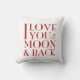 Romantisk röd-på-vit "kärlek dig till den måne- och baksida" dekorativ kudde. Skräddarsy den!", när du klickar ", du kan leka med bakgrundsfärgen.