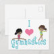 Det här söta Jag älskar gymnastik vykortet visar en söt liten svart flicka och ett vackert spanskt barn som gör volt på bokstäverna. En vacker teckning av en afroamerikansk gymnast.