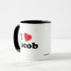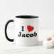 Jag älskar Jacob! Är ditt namn Jacob? Har du en fru, en flickvän, en kvinnlig familjemedlem eller en kvinnlig vän som du vet kärlekar dig? Eller har du en make, en pojkvän, en male familjemedlem eller en manlig vännen namngav Jacob som du älskar djupt? Om så, är denna "som jag älskar" muggen, exakt gåvan som du söker efter! Designen presenterar brev "mig" i svart bokstäver med en röd hjärta på det bästa och "Jacob" i svart bokstäver på grunden.