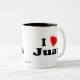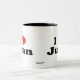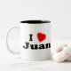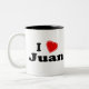 Jag älskar Juan! Är ditt namn Juan? Har du en fru, en flickvän, en kvinnlig familjemedlem eller en kvinnlig vän som du vet kärlekar dig? Eller har du en make, en pojkvän, en male familjemedlem eller en manlig vännen namngav Juan som du älskar djupt? Om så, är denna "som jag älskar" muggen, exakt gåvan som du söker efter! Designen presenterar brev "mig" i svart bokstäver med en röd hjärta på det bästa och "Juanen" i svart bokstäver på grunden.