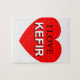 Jag älskar kefir. Kefir är en naturlig probiotisk dryck gjord på mjölk. Rött hjärta med text.