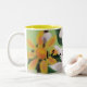 Blom- design för vitdaisy- och pussypil på ljust - grön bakgrund. Vitklippning överst och grund av muggen, gul insida. Greeting- "älskar jag mormor". Högväxt mugg.