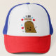 Rolig glad brun potatis omgiven av röda och blå kärlekshjärtan med Jag älskar potatis i svart och brun bokstavering ovanför hans huvud.