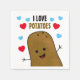 Rolig glad brun potatis omgiven av röda och blå kärlekshjärtan med Jag älskar potatis i svart och brun bokstav ovanför hans huvud.