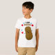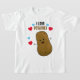 Rolig glad brun potatis omgiven av röda och blå kärlekshjärtan med Jag älskar potatis i svart och brun bokstav ovanför hans huvud.