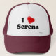 Jag älskar Serena! Är ditt namn Serena? Har du en make, en pojkvän, en male familjemedlem eller en manligvän som du vet kärlekar dig? Eller har du en fru, en flickvän, en kvinnlig familjemedlem eller en kvinnlig vän som namnges Serena som du älskar djupt? Om så, är denna "som jag älskar" hatten, exakt gåvan som du söker efter! Designen presenterar brev "mig" i svart bokstäver med en röd hjärta på det bästa och "Serenaen" i svart bokstäver på grunden.