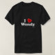 Jag älskar Wendy! Är ditt namn Wendy? Har du en make, en pojkvän, en male familjemedlem eller en manligvän som du vet kärlekar dig? Eller har du en fru, en flickvän, en kvinnlig familjemedlem eller en kvinnlig vän som namnges Wendy som du älskar djupt? Om så, är denna "som jag älskar" skjortan, exakt gåvan som du söker efter! Designen presenterar brev "mig" i vitbokstäver med en röd hjärta på det bästa och "Wendyen" i vitbokstäver på grunden.