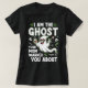 En roligt och en humoristisk Halloween-temad grafisk design med en coola, tecknadens spöke som bär solglasögon och ge ett fredstecken. Spöket håller kaffe kopp och texten "JAG ÄR GHOST YOUR MAMMA WARNED DIG OM" visas på en framträdande plats i ett fet, snyggt teckensnitt. Utformningen är accentuerad med små döskallar, godis och spindelnät och är perfekt för t-shirts, mugg eller andra kläder.