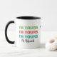 Här är en roligt mugg som gör en underbar Alla hjärtans dag-gåva, särskilt när du är fylld med din älskings favoritgodis! Grönt, röd och blå text säger "Jag är din" tre gånger, med svart skript under där det står "Ingen återbetalning". Texten upprepas två gånger i mugg, med tre fält i mitten som du kan anpassa. Cute, och det kommer definitivt att ge ett leende!