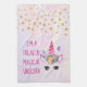 En kökshandduk med ett lustigt ordspråk: Jag är en jävla trollkarl. Designad med en rosa unicorn med en söt blommigt krona och två mjuka fjärilar som flödar över hennes huvud. En bakgrund med pastellfärgerna färg. Faux guld konetti sprinklade längs toppen.