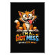 En vilt uttrycksfull och underhållande illustration av en storögd, sablande rödhårig katt i ett tillstånd av fullständigt kaotisk oordning, i kombination med djärv, eldig typografi som perfekt fångar den älskvärda, urledda energin hos det ultimata heta rövarbot.