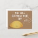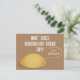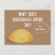 Ett vykort med ett brödskämt. Designen frågar ”Vad säger surdegsbröd?” Och det illustrerade brödlimpan nedan svarar ”Jag är en självstartare!” Vykortets färgschema är brunt och vitt.