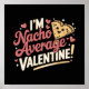 Utformningen har en skarp fras: "Jag är Nacho Average Valentine!" Ord "Nacho" är en lek på frasen "inte din". Texten ställs in i ett fet, stiliserat teckensnitt med ett mousserande, glittrande struktur i en pastellövertoning av rosa och orange. Ett centralt inslag i konstruktionen är en tecknad-stil hjärtformad nacho-chip med ett leende ansikte, täckt av en osttopp. Hela bilden är försedd med små hjärtan och stjärnor, vilket ökar dess charmerande och tilltalande ton. Den svarta bakgrunden gör det varma färgen och gnistran på designen, skapar det ett val av perfekt för ett gratulationskort, t-shirt eller social-mediekort.