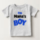 Jag är Nanas T-shirts, långärmad T-tröjor, kroppsdräkter inklusive organiska kroppsdräkter, fotbollsdykostymer, hattar, romer, mörk T-shirts, raglan T-shirts och andra kläder med en ljusblå och svart textdesign som lyder: Jag är Nanas Boy!